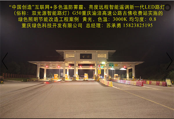 我司在G50重慶渝涪高速公路古佛收費(fèi)站實(shí)施的“中國創(chuàng)造”互聯(lián)網(wǎng)+多色溫防霧霾LED全智能路燈綠色照明節(jié)能改造工程,使用的“中國創(chuàng)造”互聯(lián)網(wǎng)+多色溫防霧霾LED全智能路燈及智能管理系統(tǒng),其具備多項(xiàng)特點(diǎn):(一)通過PM2.5、溫度、光敏、色溫、超聲波雷達(dá)等傳感器、高清攝像頭自動采集智慧城市所需的環(huán)保、氣象、交通、安防等公共數(shù)據(jù)信息,通過“云平臺”實(shí)現(xiàn)共享,并利用智慧城市網(wǎng)絡(luò)、LED彩屏、微信、短信等信息平臺,向社會免費(fèi)提供各類信息及Wifi等服務(wù)。(二)在不同氣候和季節(jié),可根據(jù)人們的感官需求及環(huán)境氣候的變化,通過溫度、濕度、PM2.5等傳感器遠(yuǎn)程智能調(diào)控?zé)艟叩纳珳亍⒘炼龋瑢?shí)現(xiàn)多種色溫、亮度舒適安全照明。遠(yuǎn)程智能控制系統(tǒng)自動采集照明環(huán)境溫度、雨、霧、霾、雪、沙塵等數(shù)據(jù),智能將燈光色溫精細(xì)化調(diào)節(jié)到最舒適、最安全的照明值。在雨、霧、霾、雪、沙塵暴等惡劣天氣下,通過遠(yuǎn)程智能控制系統(tǒng)(包括手機(jī)APP)調(diào)控?zé)艄庹彰魃珳兀褂么┩改芰?qiáng)的黃光(3000K色溫)照明,有效保障了在雨、霧、霾、雪、沙塵暴天氣下城市路燈安全照明和行車安全;在正常天氣下,根據(jù)環(huán)境溫度將燈光色溫智能調(diào)控為最舒適照明狀態(tài)。(三)根據(jù)不同時間段、光照度、車流量等情況,分別通過光敏、超聲波、雷達(dá)等傳感器智能調(diào)控?zé)艟撸瑢?shí)現(xiàn)多種亮度燈光照明模式。可在不同時段將燈光智能調(diào)整為“白天”、“夜間”、“夏季”、“冬季”、“防霧霾”等多種照明模式,從而極大提高節(jié)電率,同時有效解決隧道照明為了節(jié)電普遍采用的關(guān)閉控制回路或者間隔關(guān)燈方式而造成照明暗區(qū),存在交通安全隱患的問題,實(shí)現(xiàn)無暗區(qū)的二次節(jié)能和安全、舒適照明,確保行車安全。(四)路面亮度均勻度、照度均勻度、節(jié)能率等重要參數(shù)均優(yōu)于LED路燈國家標(biāo)準(zhǔn)。互聯(lián)網(wǎng)+多色溫防霧霾LED全智能路燈一盞可當(dāng)多盞普通單色溫LED路燈使用,性價比更高,可提高光效10%,延長燈具使用壽命一倍以上。智能調(diào)色、調(diào)光,確保照明更加舒適、安全、節(jié)能。