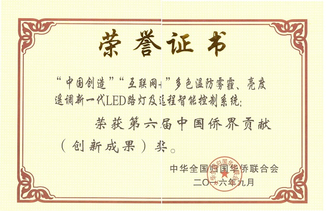 我司研發制造的“中國創造”“互聯網+”多色溫防霧霾、亮度遙調新一代LED路燈及遠程智能控制系統于2016年9月榮獲第六屆中國僑界貢獻(創新成果)獎。