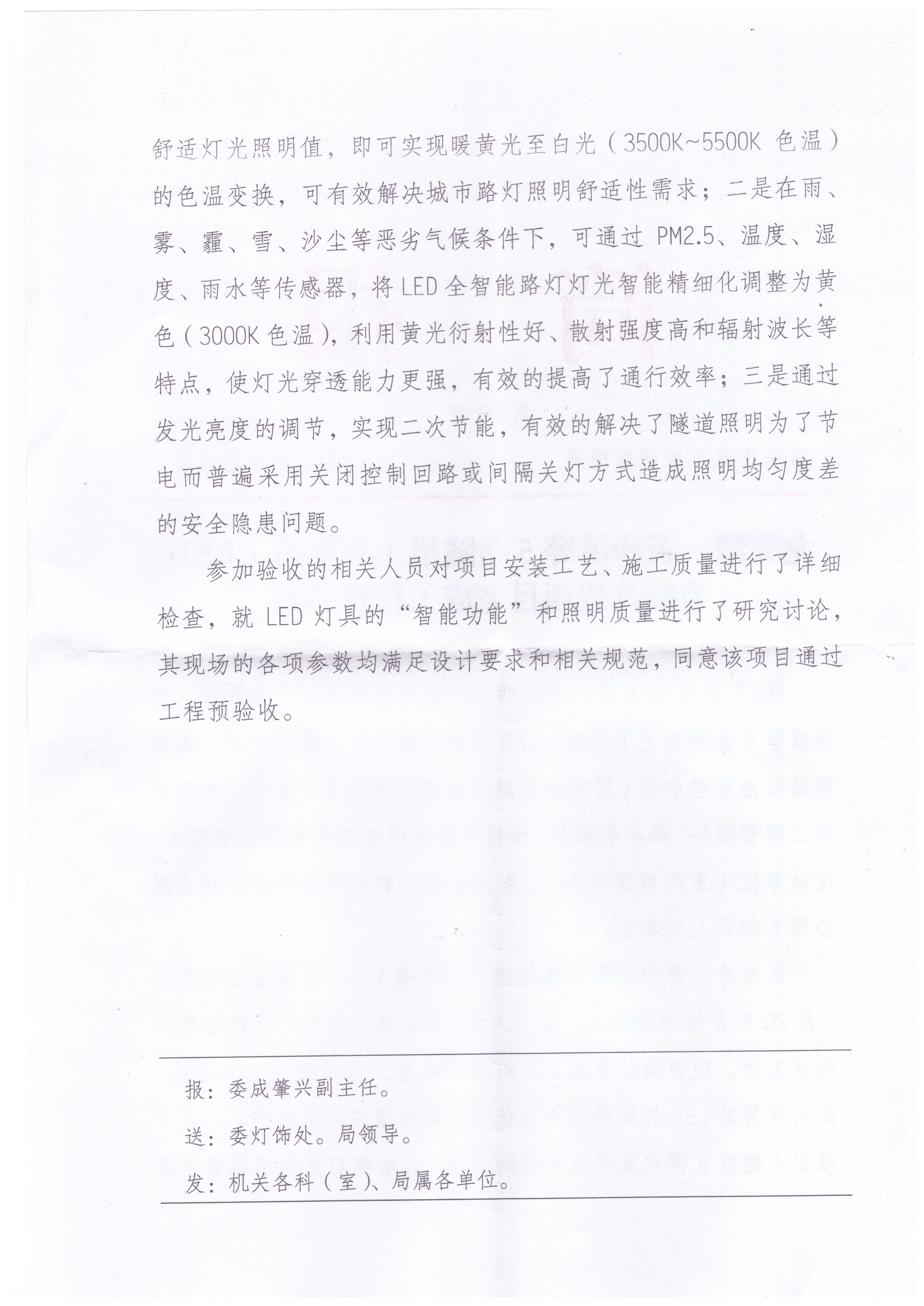 2017年7月31日,我司使用“中國創造”“互聯網+”多色溫防霧霾LED全智能路燈在重慶市龍家灣、黃沙溪、袁家崗、鵝嶺、陳家坪隧道實施科技節能改造工程已全面竣工。2017年9月6日,該項目建設單位重慶市城市照明管理局、監理公司及設計公司對該項目進行了現場預驗收,參會人員對該創新專利產品作出了極高的評價。會后,重慶市城市照明管理局專門印發了《龍家灣、黃沙溪等5條隧道(下穿道)LED節能改造項目完成工程預驗收》簡報(附后),其上級主管部門重慶市城市管理委員會對其進行了新聞報道。