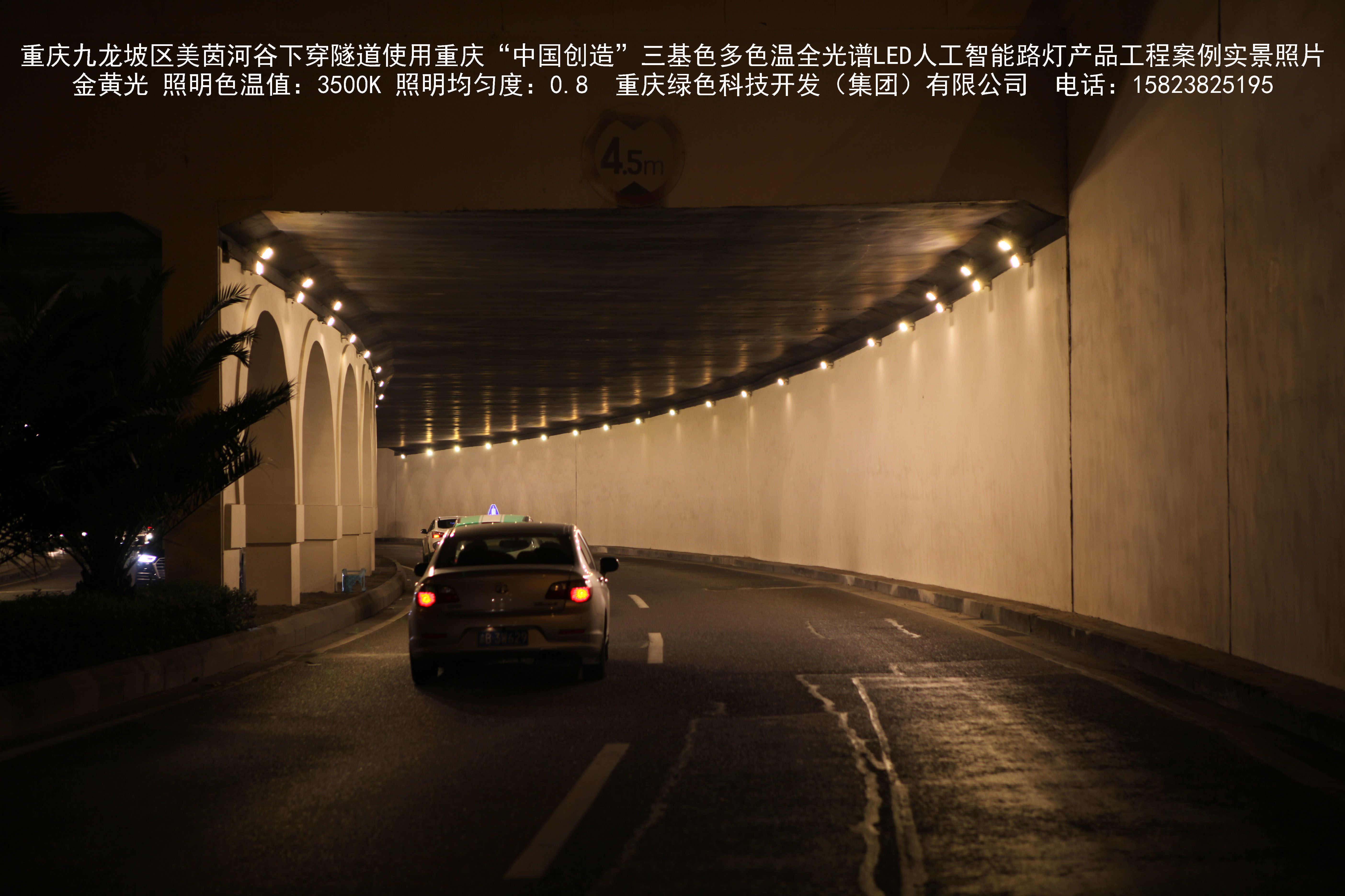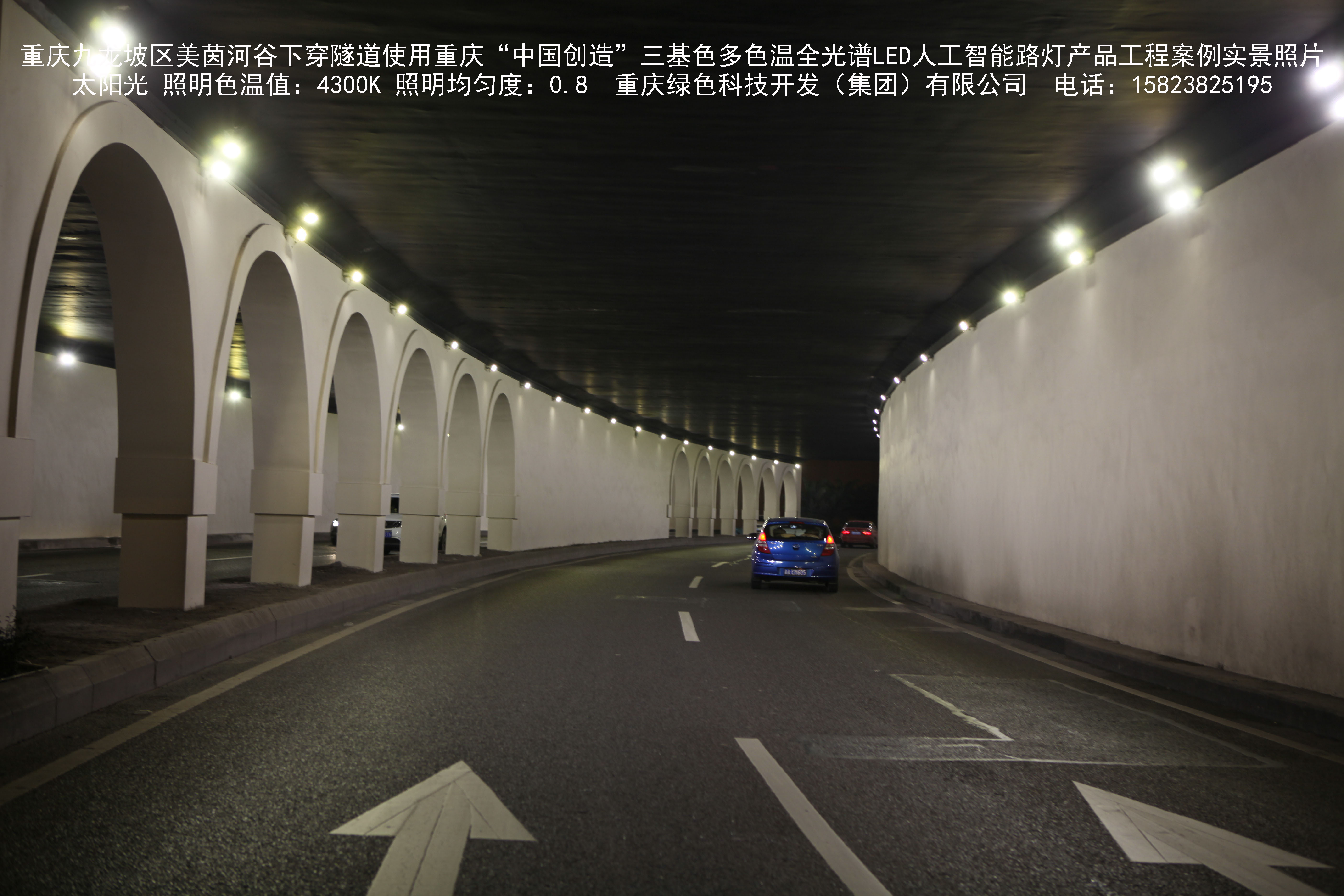 2018年9月,重慶市九龍坡區城市管理局使用我司自主研發制造的重慶“中國創造”三基色多色溫全光譜LED人工智能隧道燈系列產品,實施了美茵河谷下穿隧道市政設施品質提升工程。該工程已全面竣工。工程實施后,極大地提高了城市照明清晰度、燈光均勻度、舒適度。通過智能終端實現單燈感知、線纜防盜報警,與原高壓鈉燈相比,節能率60%以上,有效解決了關閉控制回路或間隔關燈方式造成的照明暗區,確保行人和車輛通行的安全,實現城市路燈照明系統的智能化管理,推進了智慧城市建設。