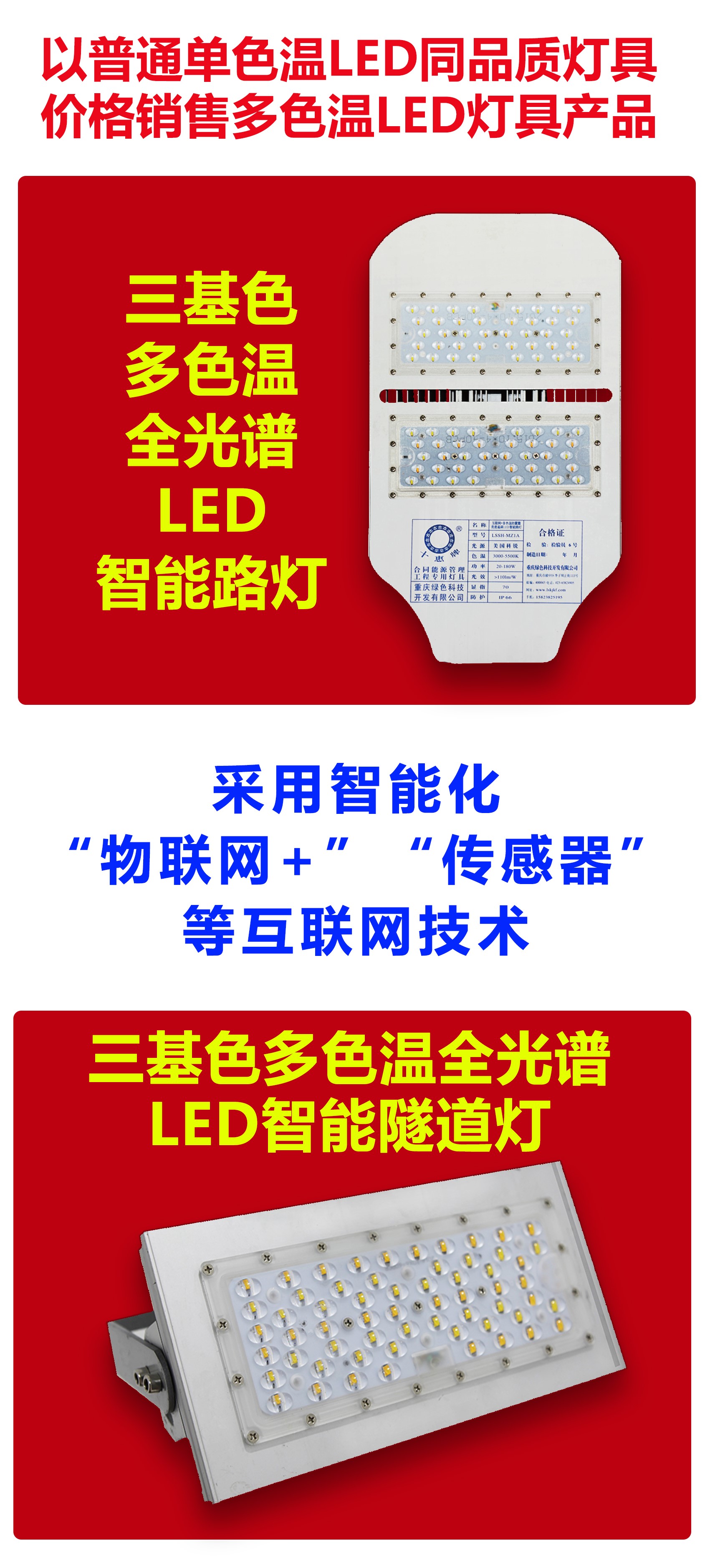 重慶“中國創造”三基色多色溫全光譜LED人工智能路燈技術是世界城市路燈照明領域淘汰普通單色溫LED路燈的先進制造技術,市場前景巨大。為了進一步開拓多色溫LED智能路燈照明市場,重慶綠色科技開發(集團)有限公司(以下簡稱我司)擬尋覓誠實守信、具有實力的LED電源制造公司、LED路燈燈具制造公司合作,整合資源優勢,免費開放多色溫全光譜LED智能路燈、智能終端控制器制造技術,在合作期間免費提供國家級“智慧城市”城市照明夜景燈飾四級考評管理共享平臺使用,通過技術共享,實現共同對外銷售,達到雙贏的目的,請有意合作者與我們聯系……