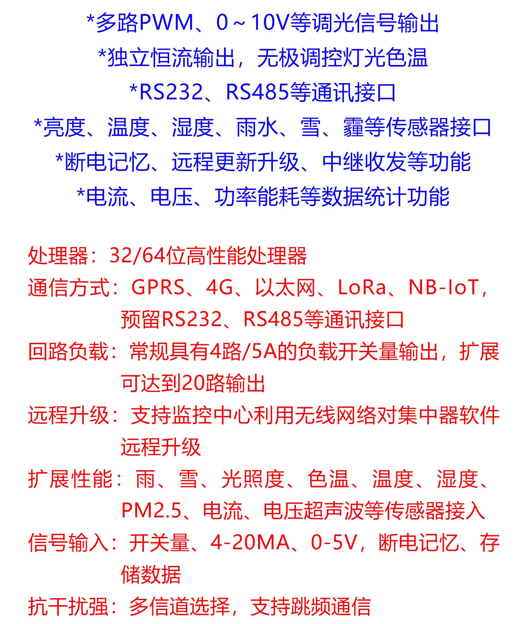 “智慧城市”城市照明燈飾四級考評管理共享平臺在兼具電力載波、Zigbee、RS485等傳統通信控制系統功能基礎上,搭載三基色多色溫全光譜LED人工智能路燈(以下簡稱該技術),可實現以下十大功能: