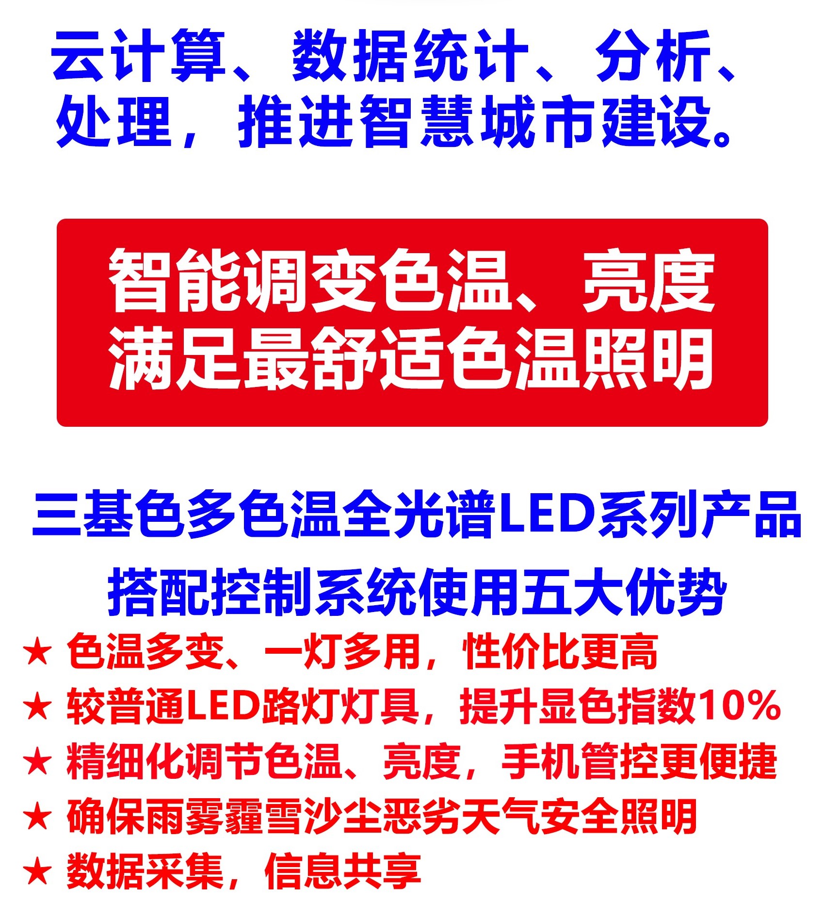 四、一盞三基色多色溫全光譜LED人工智能路燈色溫照明,可替代多盞普通單色溫LED路燈色溫照明,性價比更高,有效提高顯色指數、光效10%,色彩鮮艷度15%,燈具使用壽命更長。