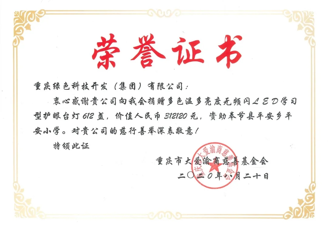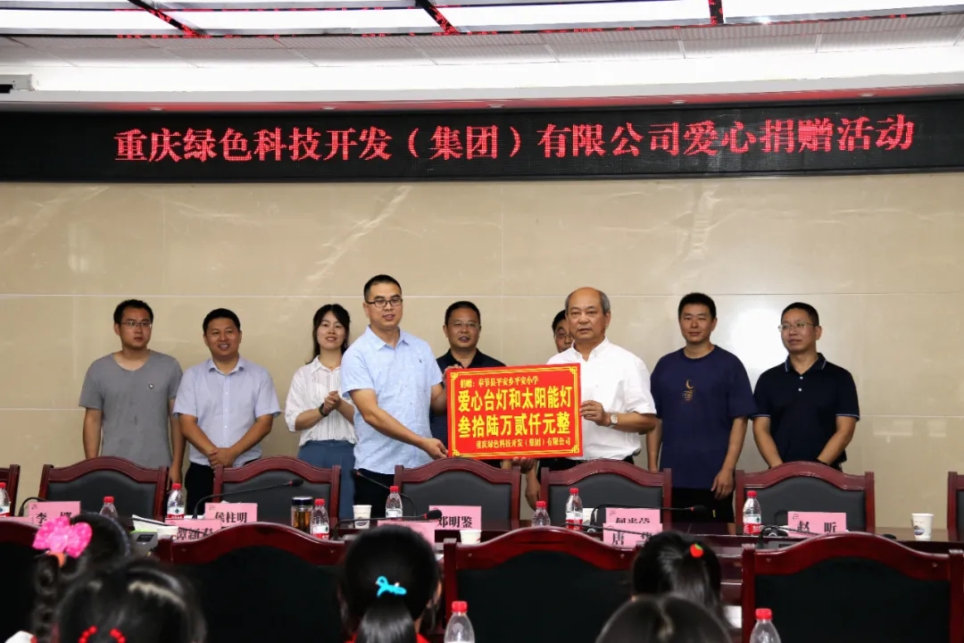 2020年8月5日,重慶綠色科技開發(集團)有限公司支持國家級重點貧困縣精準扶貧工作,通過重慶市大愛渝商慈善基金會,向奉節縣平安鄉平安小學捐贈多色溫多亮度無頻閃LED學習型護眼臺燈612盞、太陽能智慧燈桿4套,總價值36.2萬元的愛心物資,助力脫貧攻堅。